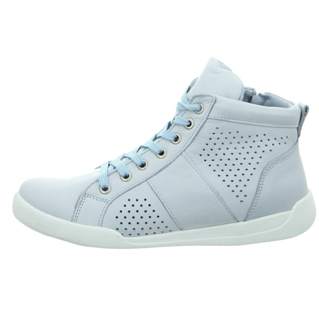 Sportiv beim Komfort aber klassisch im Look zeigt sich die Stiefelette von Andrea Conti in schönem Hellblau für Damen. Das hochwertige Glattleder ist komplett perforiert und somit ist auch an heißen Tagen für ein angenehmes Fußklima gesorgt. Die sportliche Sohle ist leicht und flexibel. Das Wechselfußbett aus Leder garantiert einen optimalen Sitz des Schuhs. Ob zum legeren Büro Outfit oder als eleganter Freizeitschuh, mit dieser Andrea Conti Stiefelette tragen Damen einen hochwertigen Allrounder.
