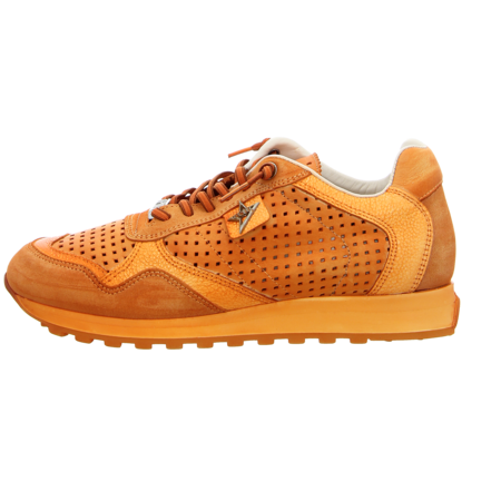 Sportlich und trotzdem stylisch sind Herren mit diesem orangen Sneaker von Cetti unterwegs. Ziernähte und eine dekorative Labelapplikation lockern das sportliche Design auf. Durch die großzügigen Perforationen ist für Luftzirkulation und ein gutes Fußklima gesorgt. Mit der Gummischnürung ist eine optimale Passform gewährleistet. Das Wechselfußbett kann bei Bedarf gegen eigene Sohlen und Einlagen getauscht werden. Mit der gut profilierten Laufsohle haben Sie auch auf schwierigen Untergründen immer einen guten Halt. Modische Herren werden von dem luftigen Sneaker begeistert sein.