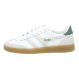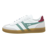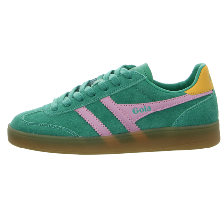 Diese Sneaker in Grün sind mit den charakteristischen Gola-Streifen an den Seiten versehen, die ihnen einen unverwechselbaren Look verleihen. Die auffälligen, farbigen Streifen ziehen sofort die Blicke auf sich und verleihen dem Schuh einen besonderen Touch. Um zusätzliche Robustheit zu gewährleisten, sind die Zehenbereiche mit Rauleder verstärkt.