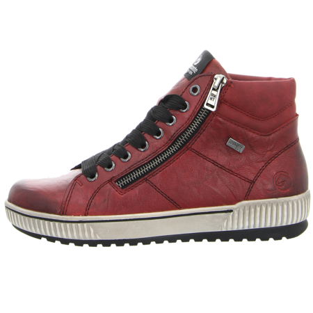 Auch in diesem roten Sneaker High verwöhnt Remonte die Füße der Damen. Das tolle Oberleder im Used Look ziert diesen tollen warm gefütterten Sneaker. Das softe textile Wechselfußbett umschließt sanft Ihre Füße und lässt sich bei Bedarf gegen eigene Sohlen tauschen. Die Reißverschlüsse auf den Außenseiten erleichtern Ihnen den Einstieg in den Sneaker. Holen Sie sich jetzt den roten Remonte Sneaker High und erleben Sie den tollen Tragekomfort!
