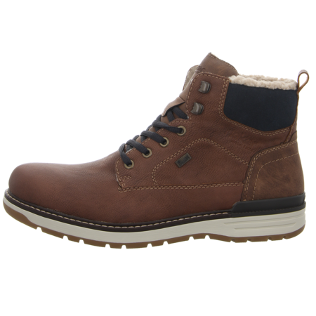 Sportiv im Look, warm am Fuß und ein Must Have für Herren ist diese braune Stiefelette von Rieker. Die hell abgesetzte Sohle und der gepolsterte Schaftrand geben dem Boot seinen sportlichen Look. Auch die inneren Werte stimmen: Warmfutter hält Ihre Füße bei niedrigen Temperaturen warm. Der Absatz dämpft Ihre Schritte und trägt zu einer natürlichen Abrollbewegung bei. Schick durch kalte Tage kommen Herren in dieser Rieker Stiefelette auf jeden Fall!